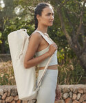 Contains 100% certified organic cotton. Premium, heavyweight fabric. Concealed, zipped valuables pocket. Rope drawcord closure. Adjustable webbing shoulder strap. Fits most yoga mat sizes.
